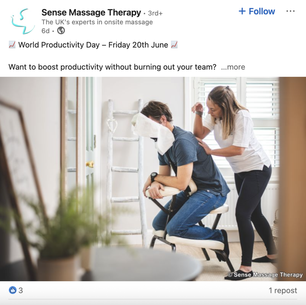 Попаднах и на този страхотен пост от център за масажи, който се възползва от 20 юни за да промотира услугата си „масаж в офиса“ и напомня че щастливите и спокойни служители често са по-продуктивни.